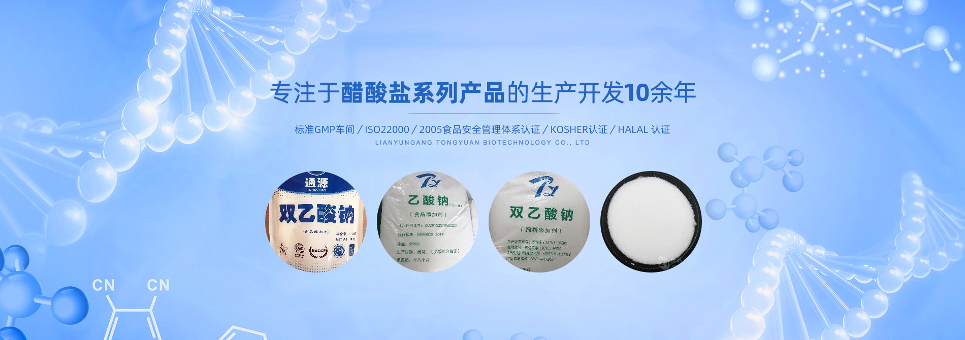 連云港市通源生物科技有限公司 是生產(chǎn)雙乙酸鈉、無水醋酸鈉、三水醋酸鈉、醋酸鉀、乙酸鈉、丙酸鈉、丙酸鈣和氯化鉀等系類醋酸鹽產(chǎn)品的專業(yè)制造商。公司專注于醋酸鹽系列產(chǎn)品的生產(chǎn)開發(fā)10余年,是國內(nèi)專業(yè)醋酸酸鹽產(chǎn)品生產(chǎn)基地?! ∧壳?,我們已和全球30多個國家和地區(qū)建立長期的業(yè)務合作關系,是中國較大的雙乙酸鈉生產(chǎn)商和出口商之一。作為中國食品添加劑和配料協(xié)會理事單位,通源公司已建成標準GMP車間5000余平方米,通過了ISO22000:2005食品安全管理體系認證、KOSHER認證、HALAL 認證等,這些都是我們提供高質量產(chǎn)品和優(yōu)良服務的前提和確保。 生產(chǎn)出色產(chǎn)品,提供優(yōu)良服務,滿足顧客需要,是我們努力的目標。愿和我們的朋友們攜手,共...